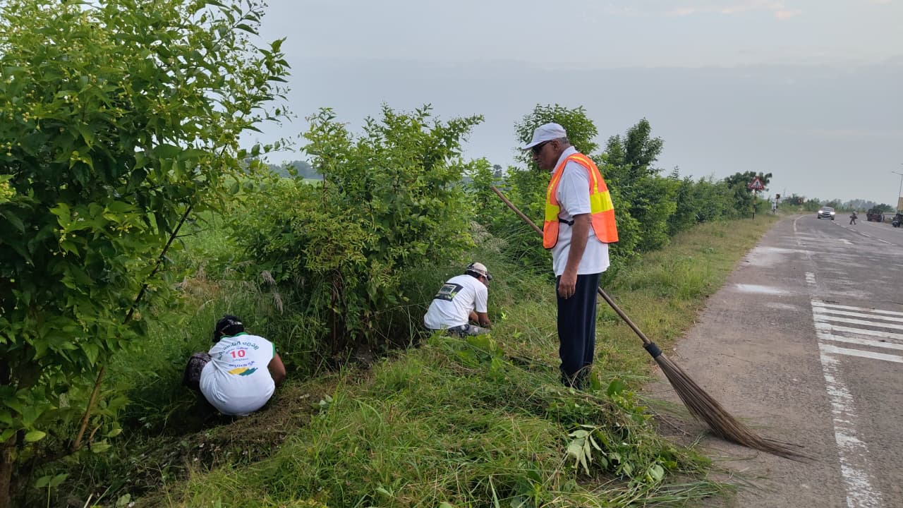 హైవేకు రెండవ ప్రక్కన ఉన్న పారిజాతం మొక్కల చుట్టూ గడ్డి ఏపుగా పెరిగి మొక్కల చుట్టూ పిచ్చి కాడ అల్లుకుని మొక్కల పెరుగుదలకు ఆటంకంగా ఉన్న కలుపును తీసివేసి శుభ్రపరిచారు.