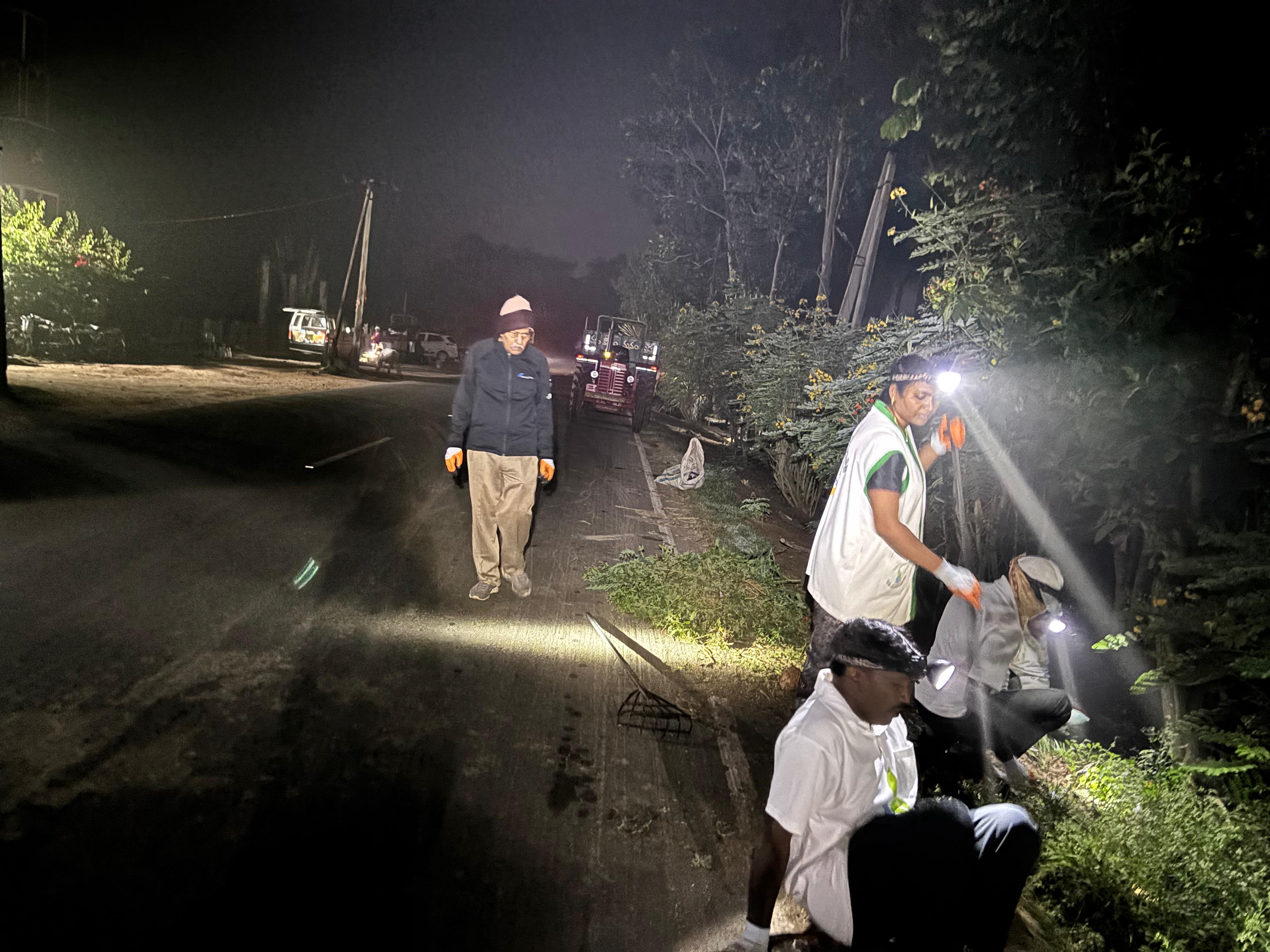 4) మిగిలిన కార్యకర్తలంతా రహదారి పడమటి మార్జిన్ లోనూ, డ్రైనేజి లో తేలుతున్న రకరకాల వ్యర్థాల తొలగింపులోనూ, మళ్లీ ఆర్నెల్ల దాక పెరగకుండా గడ్డిని నున్నగా చెక్కటంలోనూ ఎంతగా లీనమయ్యారంటే - చూస్తుండగానే 20 నిముషాల్లోనే ట్రాక్టరు నిండిపోయేన్ని వ్యర్థాలు!