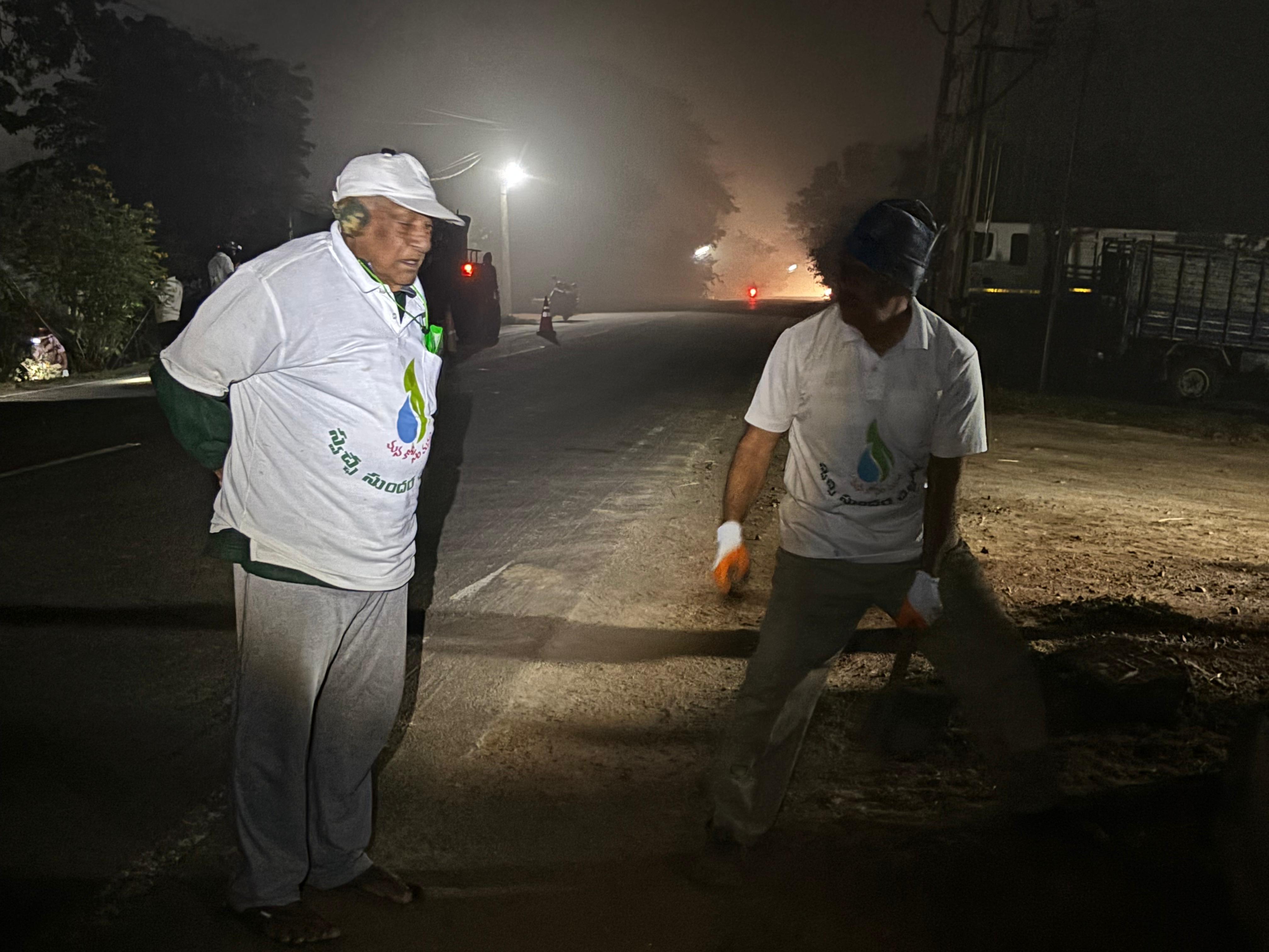 1) థర్మోకోల్ ఫ్యాక్టరీ ముందున్న గతుకుల భాగంలోనూ, డ్రైను వైపూ పెరిగిన గడ్డి, ప్రోగుబడిన ప్లాస్టిక్ వ్యర్థాలనూ పరిహరించే పనిలో ఇద్దరు కార్యకర్తలు,