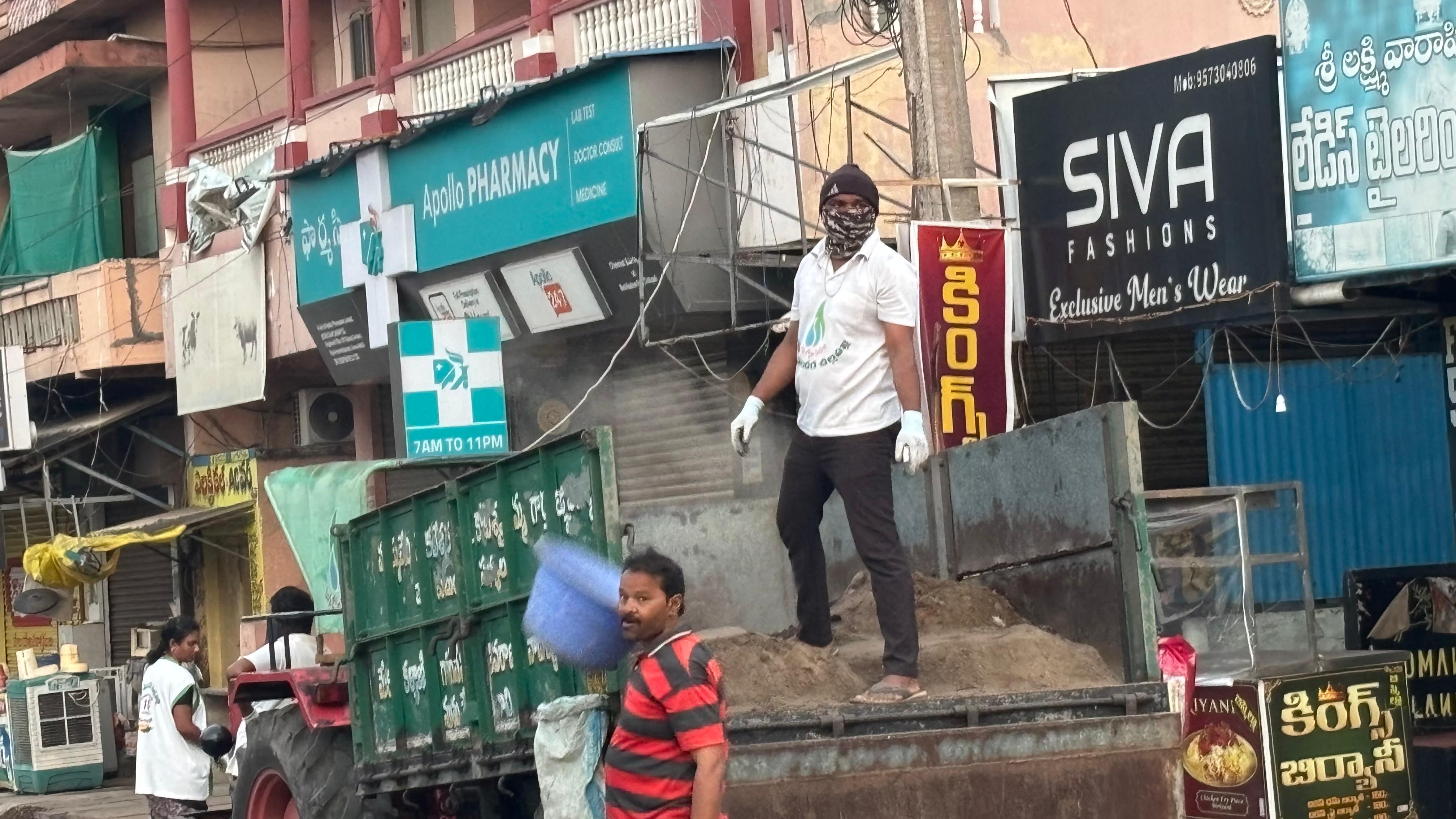 చూసేవాళ్లకు తేలిక అనిపించే మరొక కష్టమైన పని సుమారు 10 మందిది! నలుగురి చీపుళ్ళు నిర్విరామంగా ఊడిస్తే ½ కిలోమీటరు బారునా ప్రోగులు పడిన 50 కి పైగా ఇసుక-దుమ్ము మిశ్రాలను డిప్పలకెత్తి, ట్రాక్టరు నింపిన ఘనత మిగిలిన 6 గురిది!