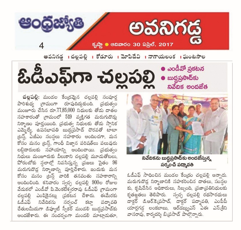 కానీ స్వచ్ఛ చల్లపల్లి ఉద్యమం 900 వ రోజు వేడుక (29.04.2017) లో అప్పటి MDO గారు MLA బుద్ధప్రసాదు గారి చేతుల మీదుగా గ్రామ సర్పంచ్, పంచాయితీ కార్యదర్శులకు ODF సర్టిఫికేట్ ను అందజేశారు.
