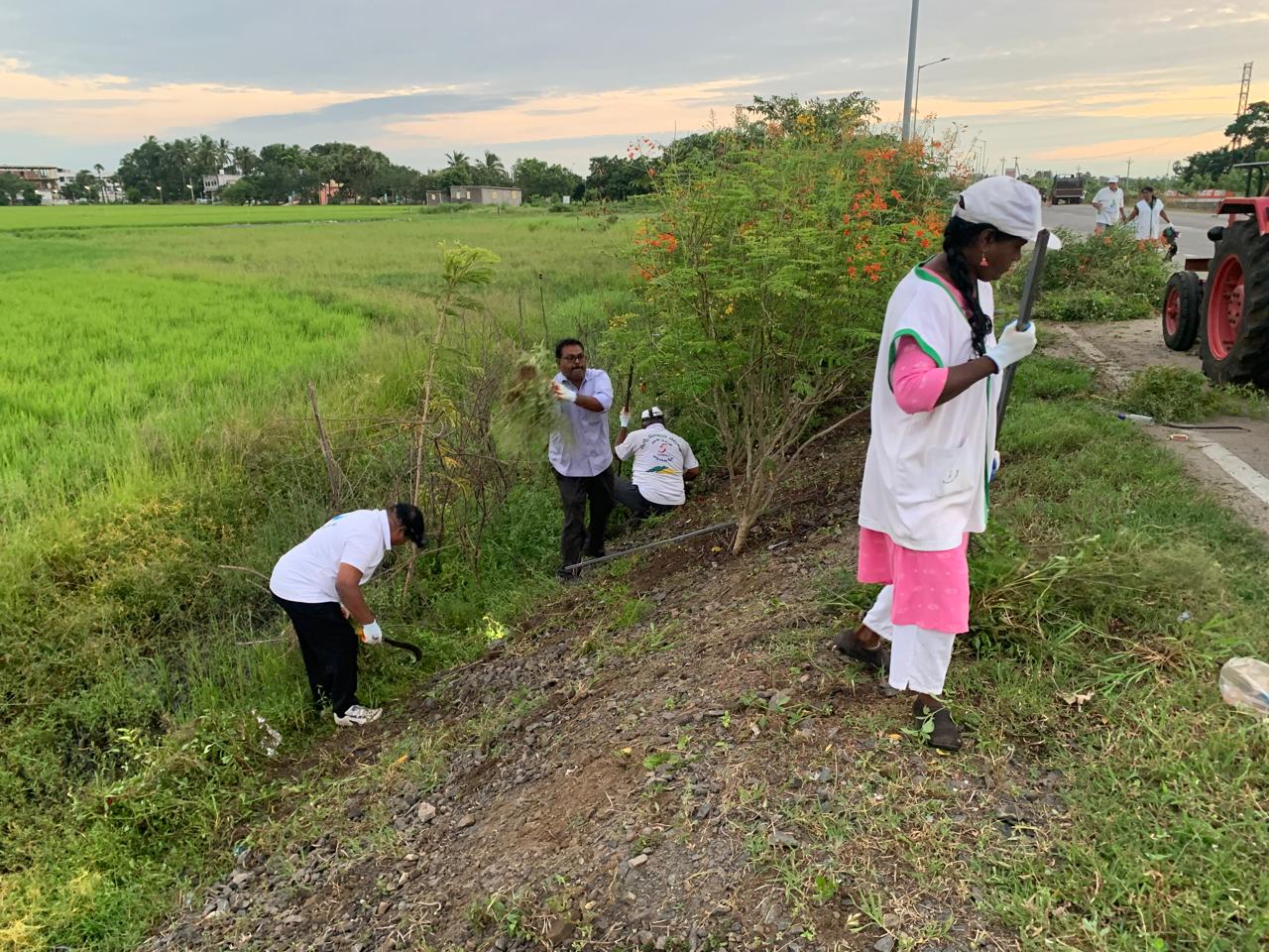 బస్టాప్ వద్ద నుండి రోడ్డు దిగువ భాగాన విపరీతమైన పిచ్చి మొక్కలు, పిచ్చి కాడ వీటిని తొలగించి మంచి నీడనిచ్చు మొక్కలు, పూల మొక్కలకు ఇబ్బంది లేకుండా చేశారు.