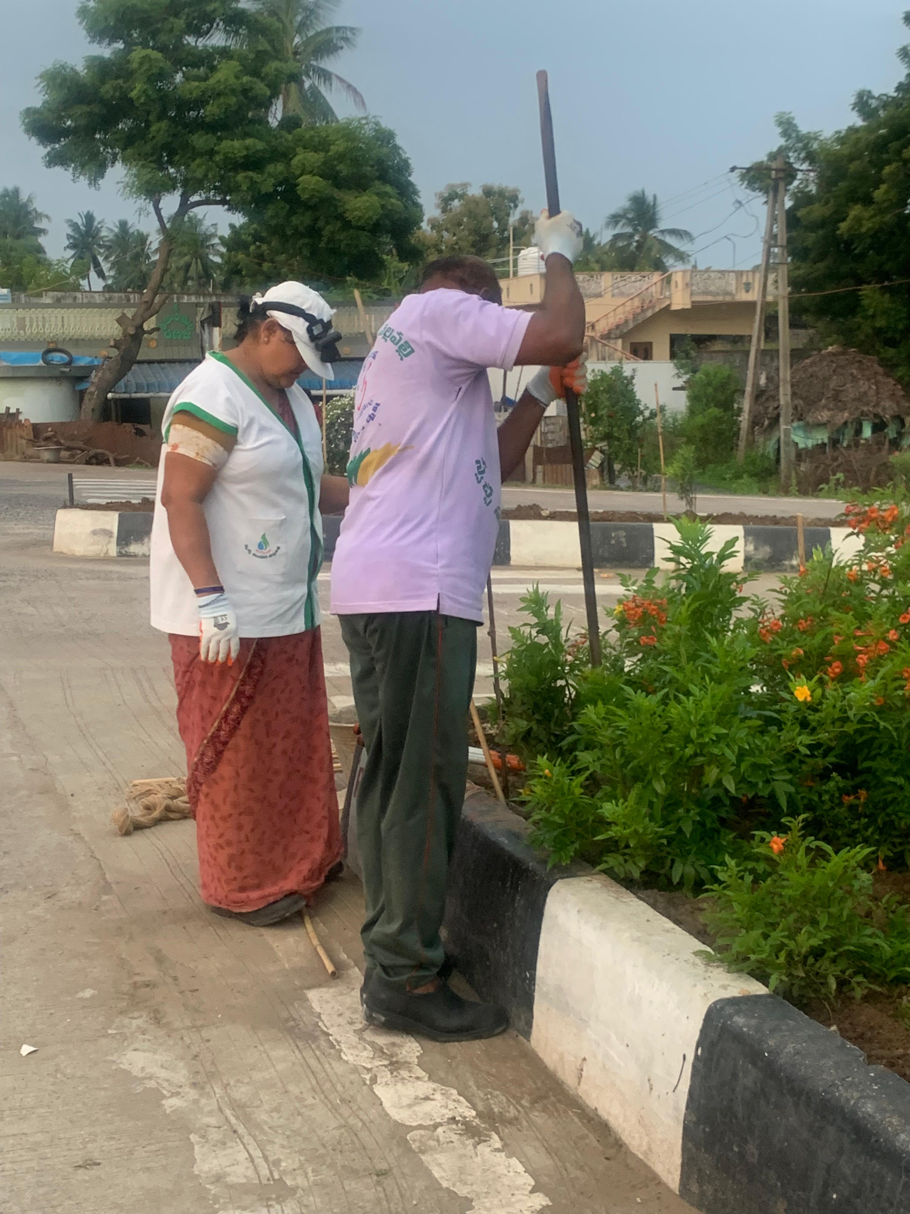 గడ్డి కోత యంత్రం సహాయంతో ఒక కార్యకర్త ఏపుగా పెరిగిన గడ్డిని సమాంతరంగా కట్ చేయడం, ఆ వెనుక ఒక స్వచ్ఛ మహిళా కార్యకర్త ఊడ్వడం జరుగుతూనే ఉంది.