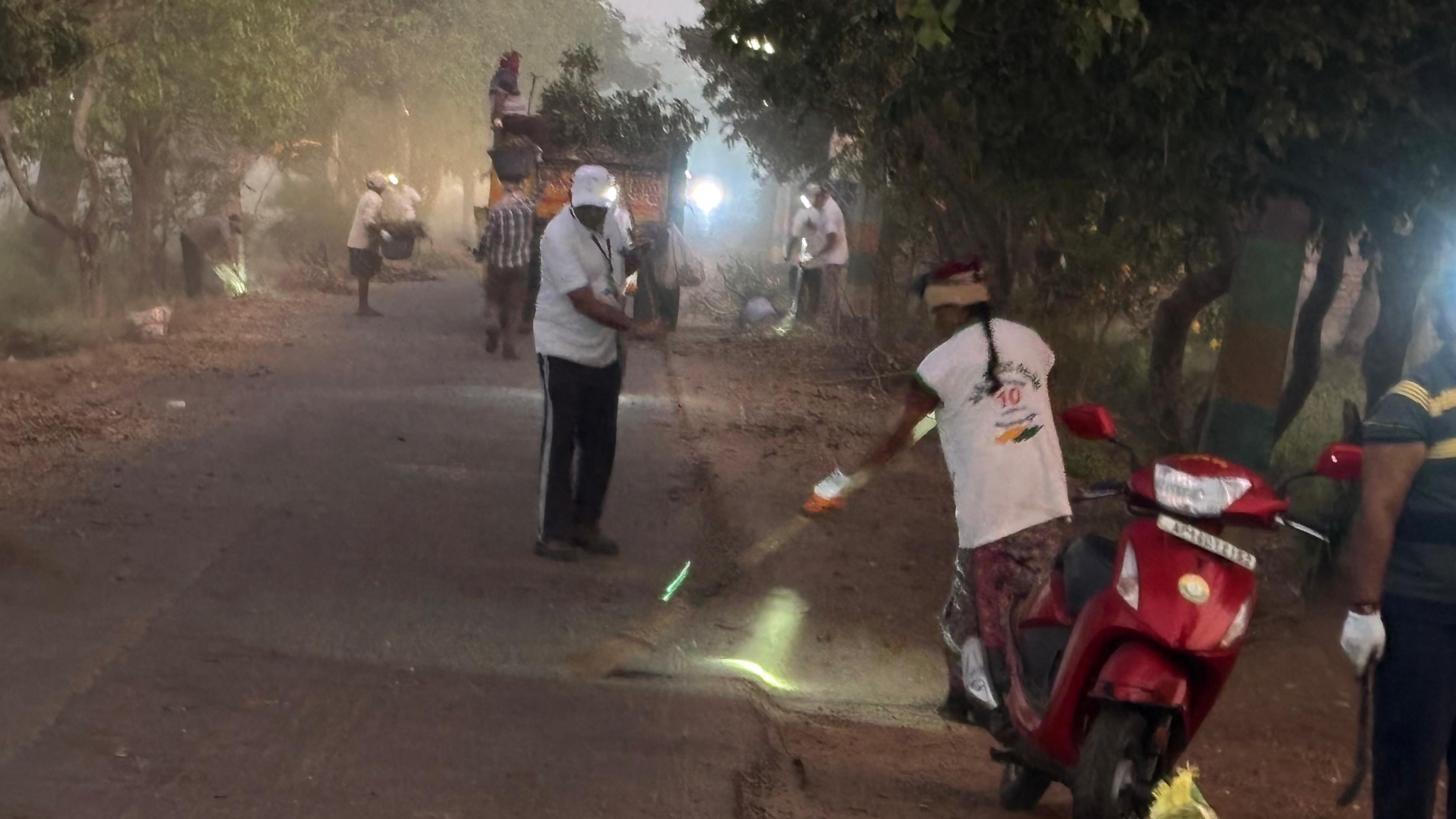 మరో నిముషానికి ఆకుల కార్యకర్త ప్రయోగిస్తున్న గడ్డి కోత యంత్రం ఆగింది. దంతెల, చీపుళ్ల లాగుడూ, ఊడ్పూ ముగించి స్వచ్ఛ మహిళా కార్యకర్తలు శుభ్రపడిన 100 గజాల రోడ్డును చూసి, మురిసిపోతున్నారు! కాఫీలకు చల్లపల్లి వెళ్లిన నందేటి కార్యకర్తా తిరిగి వచ్చాడు.