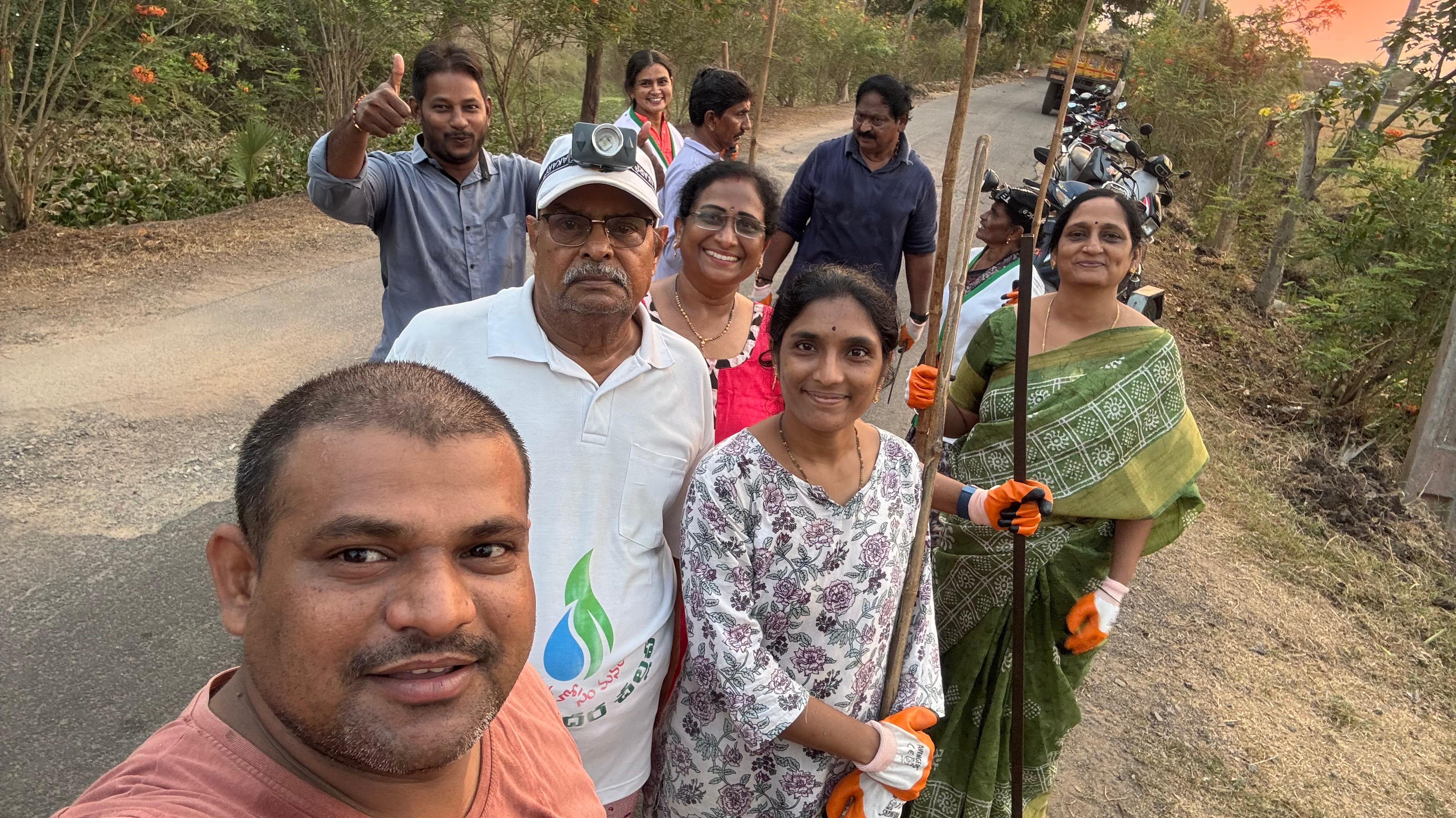 ఆ నిరీక్షణ ఫలించి, ఈ వేకువ 40 కు పైగా కార్యకర్తల బలగం రానే వచ్చింది, ఎవరి అభిమాన పనిముట్లను వారు ధరించనే ధరించారు, చెమటలు కారుతున్నా - చీపుళ్లు దుమ్ము లేపుతున్నా - తమ భుజాల మీద గ్రామ సమాజం మోపిన బాధ్యతను నెరవేర్చుకొన్నారు!